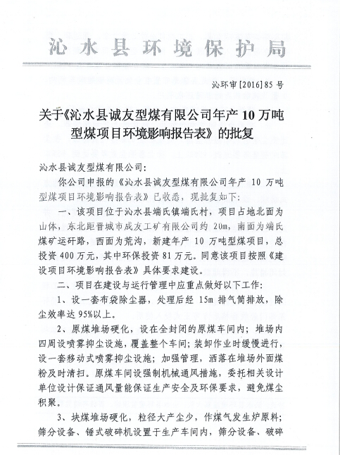 2016年10月24日,沁水縣環(huán)境保護局以沁環(huán)審[2016]85號文對該項目環(huán)境影響報告表進行了批復(fù)。