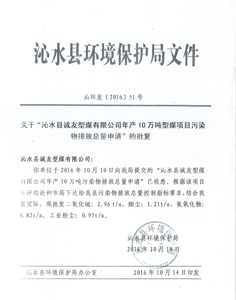 根據(jù)《山西省環(huán)境保護廳建設(shè)項目主要污染物排放總量核定辦法》晉環(huán)發(fā)[2015]25號文件,總量核定指標(biāo)不包括無組織排放量,由以上分析知本項目總量控制指標(biāo)為:粉塵0.95t/a,煙塵1.21t/a,SO2 2.96t/a,NOX  1.82t/a。2016年10月14日沁水縣環(huán)境保護局以沁環(huán)發(fā)[2016]51號文對該項目總量進行了批復(fù)。本項目運營期落實環(huán)評要求后可以滿足沁水縣環(huán)境保護局對本公司下達的總量控制指標(biāo)。