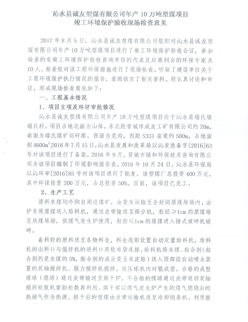 2017年8月5日,沁水縣誠友型煤有限公司組織對沁水縣誠友型煤有限公司年產(chǎn)10萬噸型煤項目進行了竣工環(huán)境保護驗收會議,參加檢查的有竣工環(huán)境保護驗收咨詢單位的代表及應(yīng)邀到會的環(huán)保專家共10人,檢查組對該工程環(huán)保措施進行了現(xiàn)場檢查,聽取了建設(shè)單位關(guān)于工程環(huán)境保護執(zhí)行情況的報告,經(jīng)認真討論和審議后,提出以下要求及建議: